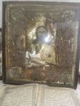 Первым экспонатом была икона - мужской образ в золоте и цветах из бумаги и воска в деревянной раме.