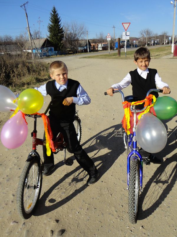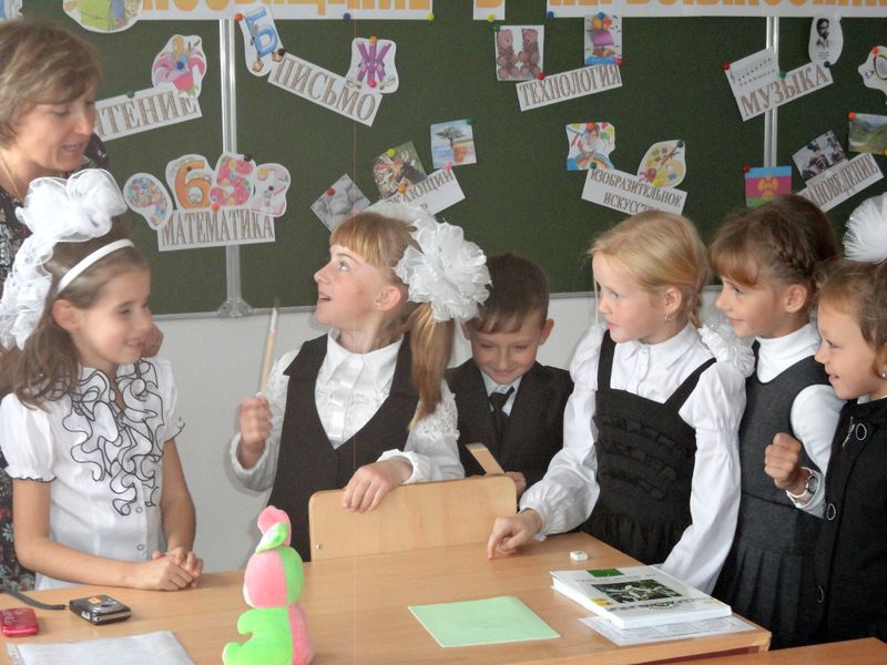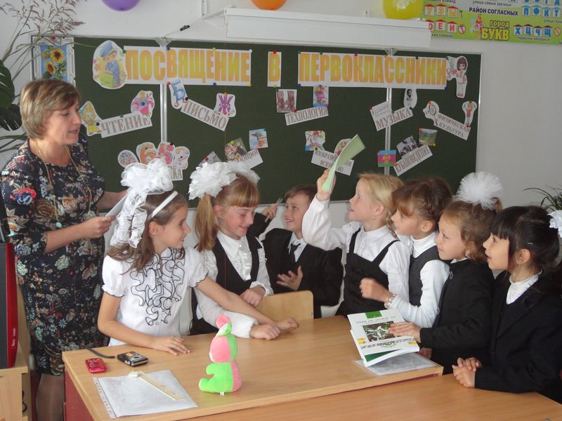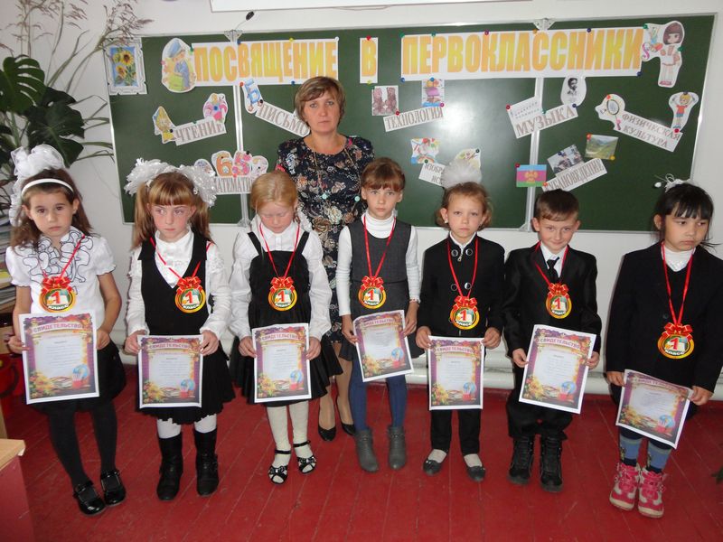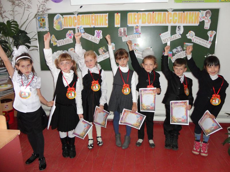 в том, что они теперь ученики и медали. Первая учительница и родители поздравили